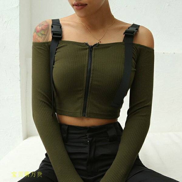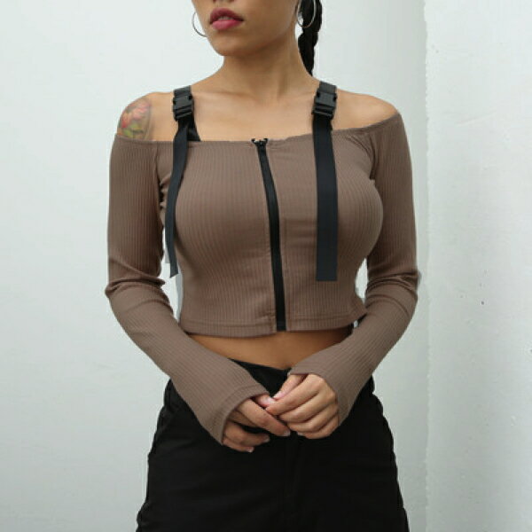 トップス 長袖 オフショルダー ジップアップ ショルダーバックル レディース ファッション 大きいサイズ ダンス 衣装 ヒップホップ 原宿系 韓国系 個性的